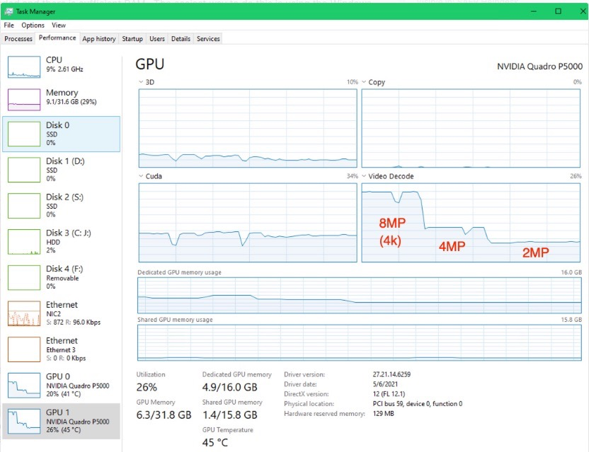 - The amount of processing needed for decode varies by the resolution of the video. At 4MP and below decode processing is approximately same as CUDA processing requirement (SAFR uses CUDA for Facial recognition). But at higher camera resolutions, Decode performance increases significantly. See screenshot below to demonstrate this. This means: