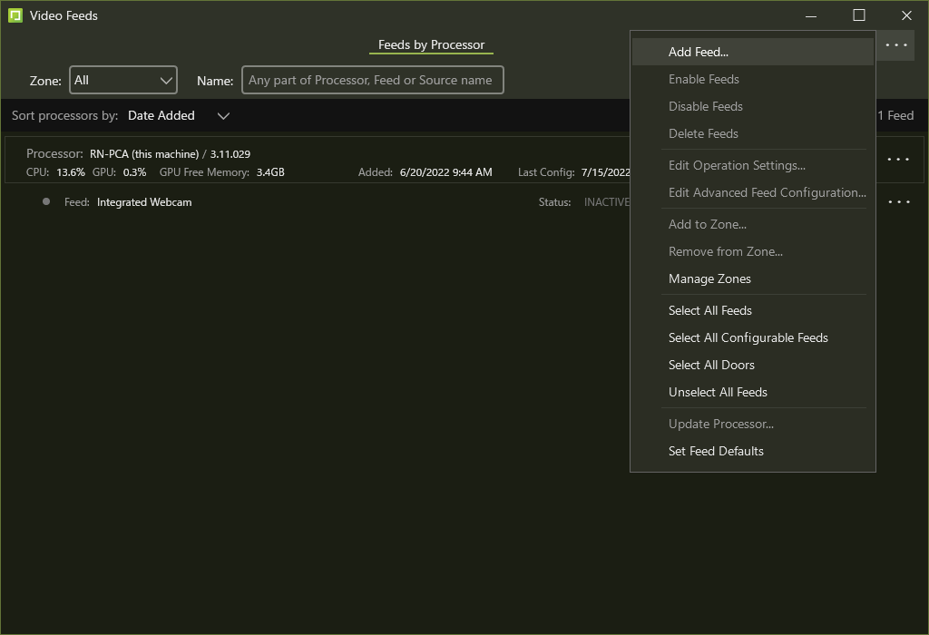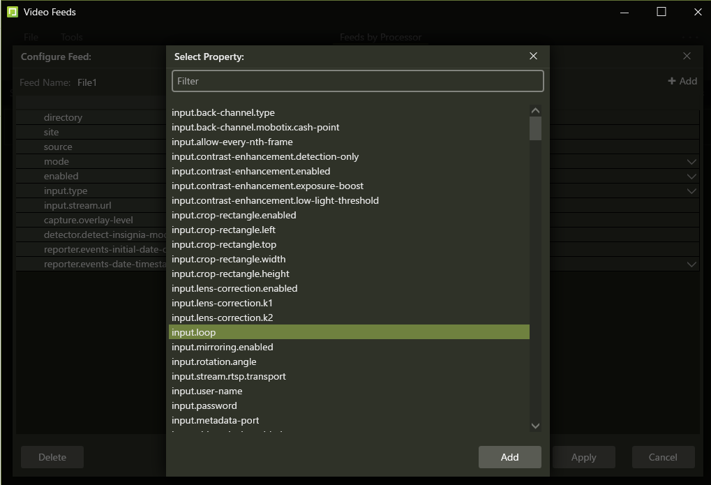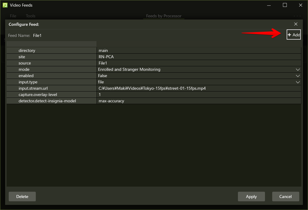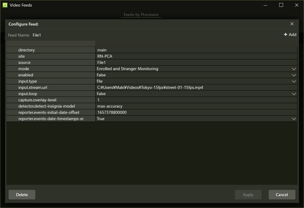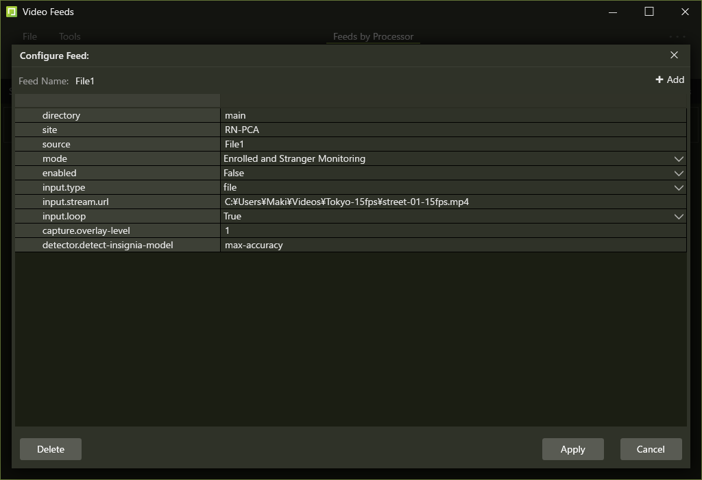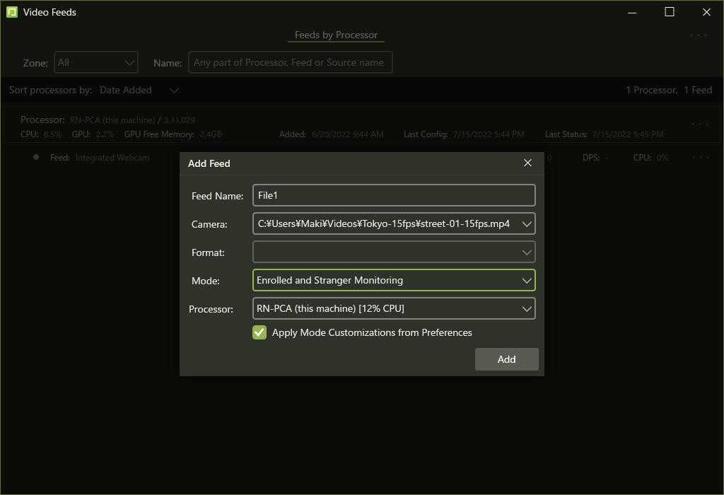 Configure "Feed Name", "Camera", "Mode". Fill in the video file path in "Camera" field. Click "Add" to add it to video feed.