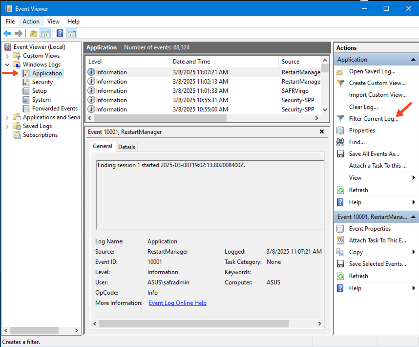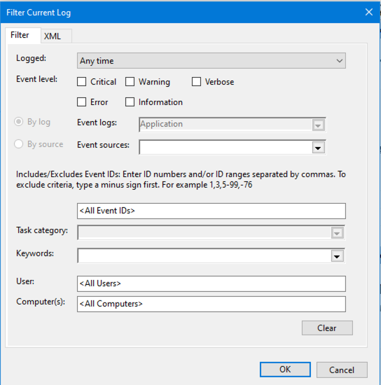 3. Select Filter Current Log on the right panel. You will see the following dialog: