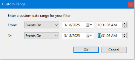 For submitting tickets, only submit a limited time range as requested. Typically 1 hour. If the issue is ongoing, then select "Last hour". If the issue occurred at a specific time, then select "Custom Range" and change the option to "Events On" and set the start and end time as shown below.