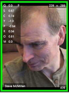 The center pose, pitch, roll, and yaw is reported in the SAFR Desktop Client and in the Video Feeds Video preview by enabling the “Recognition Details” view. The screenshot below shows these values reported as Q (center pose), Y (yaw), P (pitch), and R (roll).
