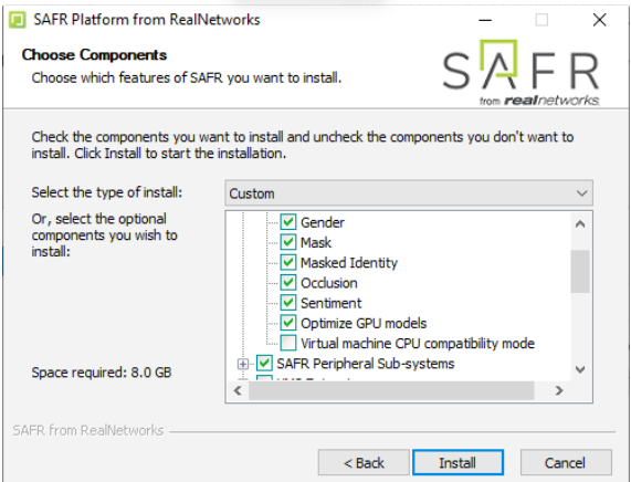 Virtual machines often limit CPU instruction sets to ensure compatibility across different hardware platforms. Unfortunately, Faceservice doesn’t support auto detection of supported instructions. This is why during the installation process you should check the Virtual Machine CPU Compatibility mode if you are installing SAFR platform in Virtual Enviroment. However, if you left it unchecked during the installation (like in the image below) the face recognition service might not work as expected. Luckily this there is an easy