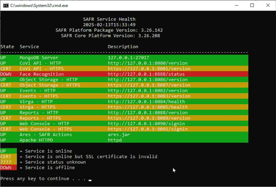 Face Recognition service will appear as offline as shown in SAFR Server Status: