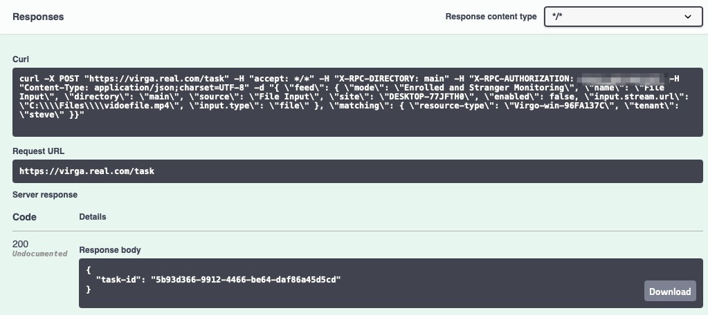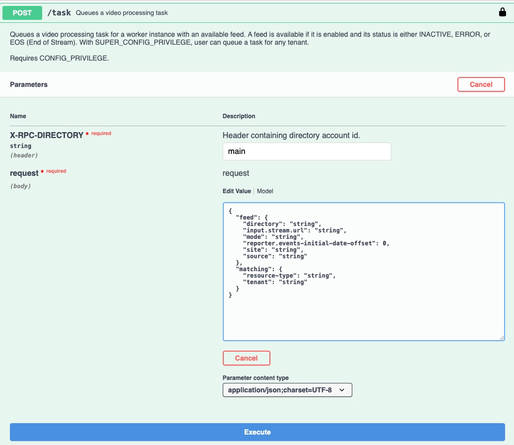 It should look something like this when you are done (your's may vary depending on your feed settings and the resource-type value should be set to your client_id obtained above.{ "feed": { "mode": "Enrolled and Stranger Monitoring", "name": "Queue1", "directory": "main", "source": "Server1", "site": "VOD Farm", "enabled": true, "input.type": "file", "input.video-clock.enabled": false "input.stream.url": "C:\\Files\\vidoefile2.mp4", }, "matching": { "resource-type": "video_file", "tenant": "yoursafraccountname" } } - Click "Execute" button