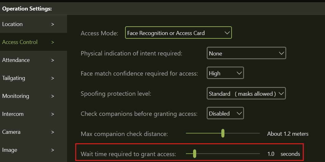 - Increase Wait time required to grant access to 1 second to give the device more time to evaluate face