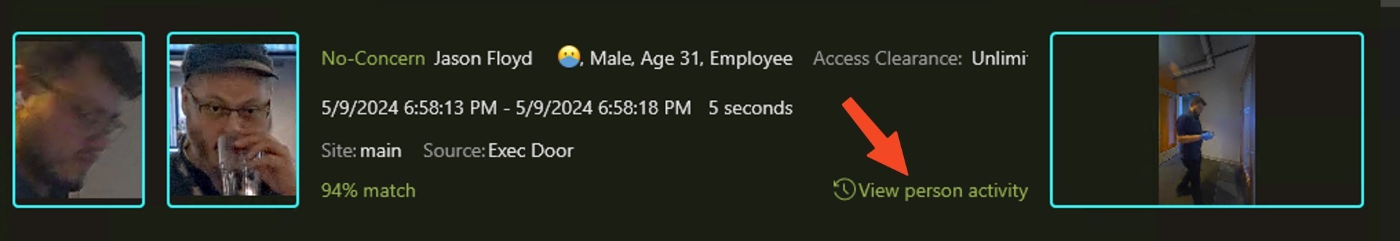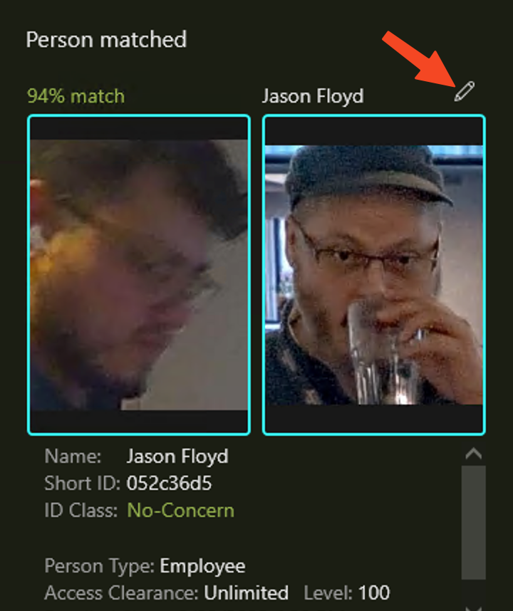 https://support.safr.com/en/support/solutions/articles/69000143721-how-to-use-identity-recognition-threshold. For info about how to interpret the % values. As you can see, 94% should only be considered a possible match. If you only want to see 100% positive matches, directions are shown how to do this below.