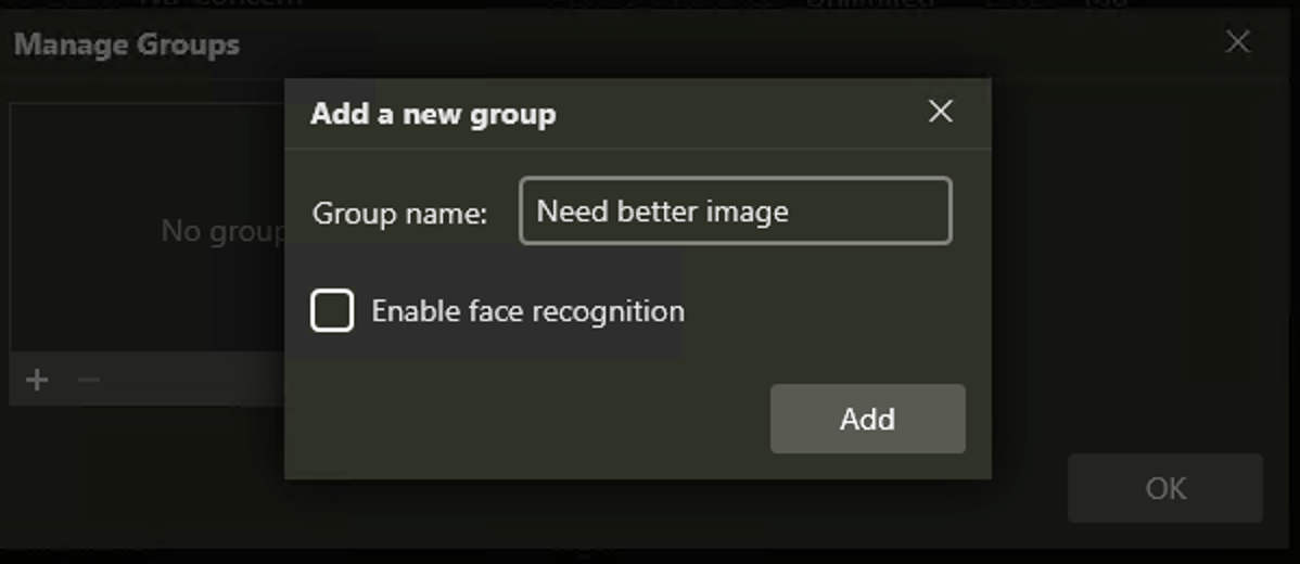 2. Click "+" to add a group. Then give group name "Needs better image" and uncheck "Enable face recognition"