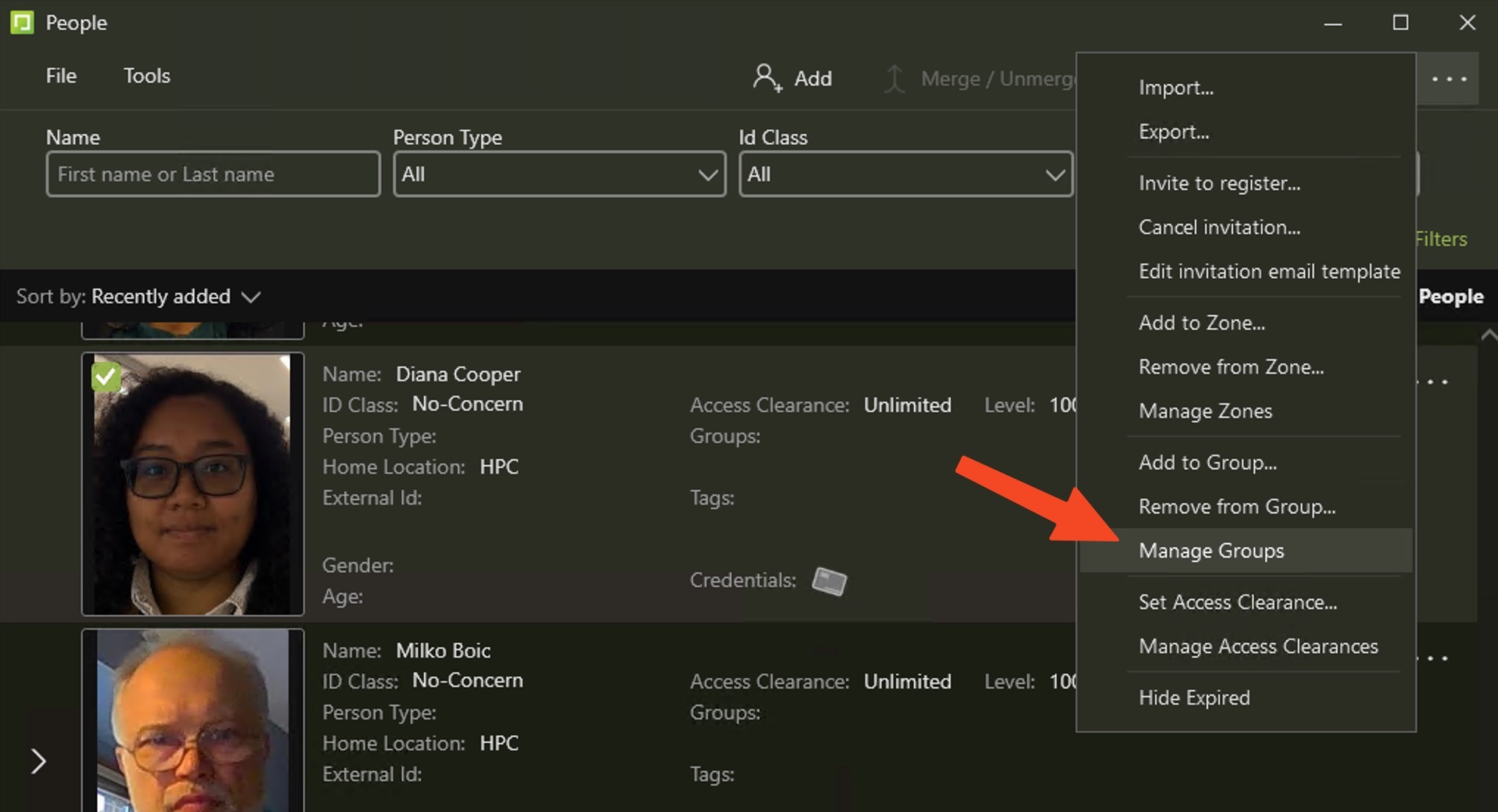 1. In people window, select "..." in upper right and click "Manage Groups"