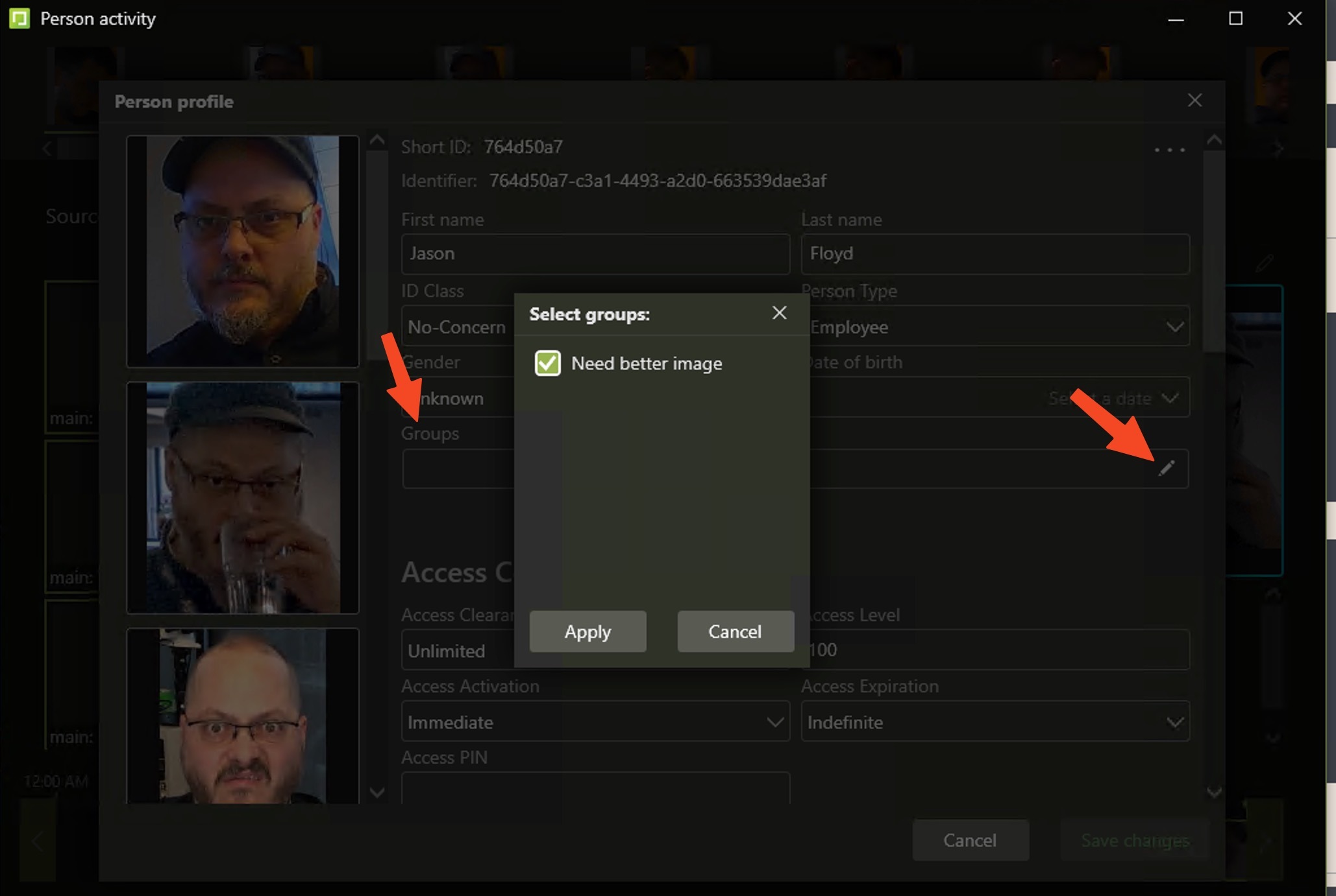In the person record, find the groups field and click the Edit button (pencil icon) and select the "Need better image" group.