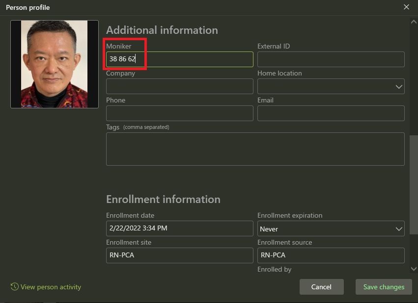 Enroll your face to SAFR, and set "38 86 62" in moniker.