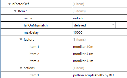 This example defines 3 factors of moniker. You need 3 correct tag to trigger this nFactorDef. When it gets correct tags, it executes defined actions.