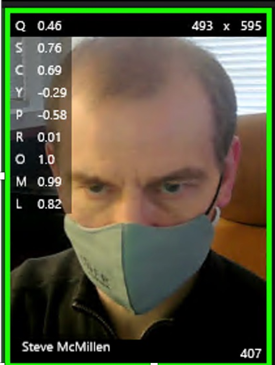 SAFR reports the value of sharpness and contrast in the Recognition Details view. Below is an example of SAFR Recognition Details panel with Center Pose Quality of 0.46, sharpness (S) reported as 0.76 and contrast (C) reported as 0.69.