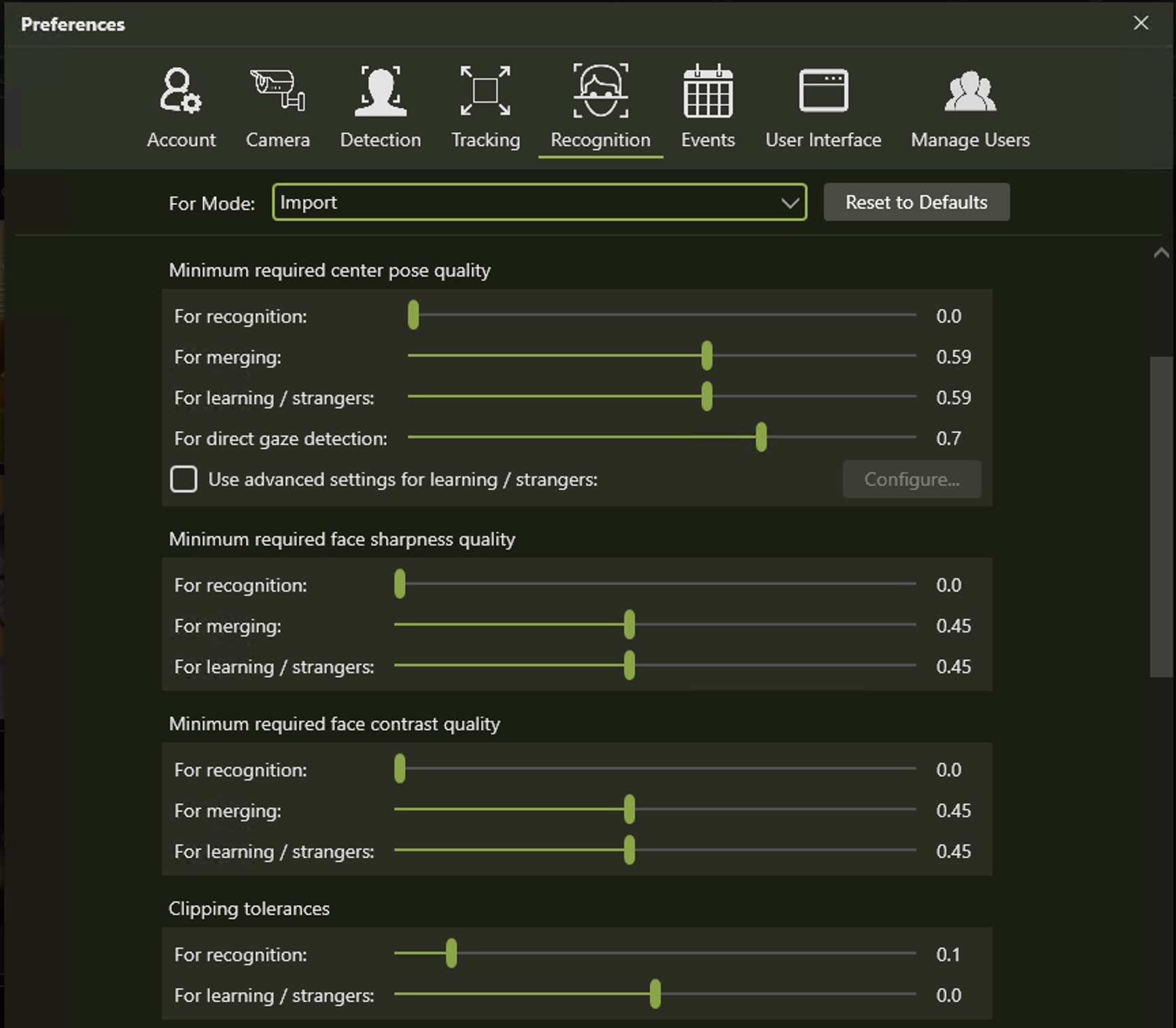 SAFR measures the sharpness and contrast with each frame of input video. This information is used to evaluate the quality of the input image to determine if it’s acceptable for recognition or learning. SAFR Recognition preferences allows you to configure the thresholds SAFR uses to determine if an image should be used for recognition or if the images is of sufficiently high quality to enroll.