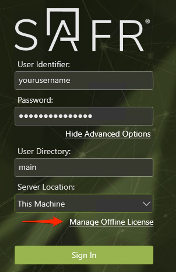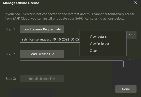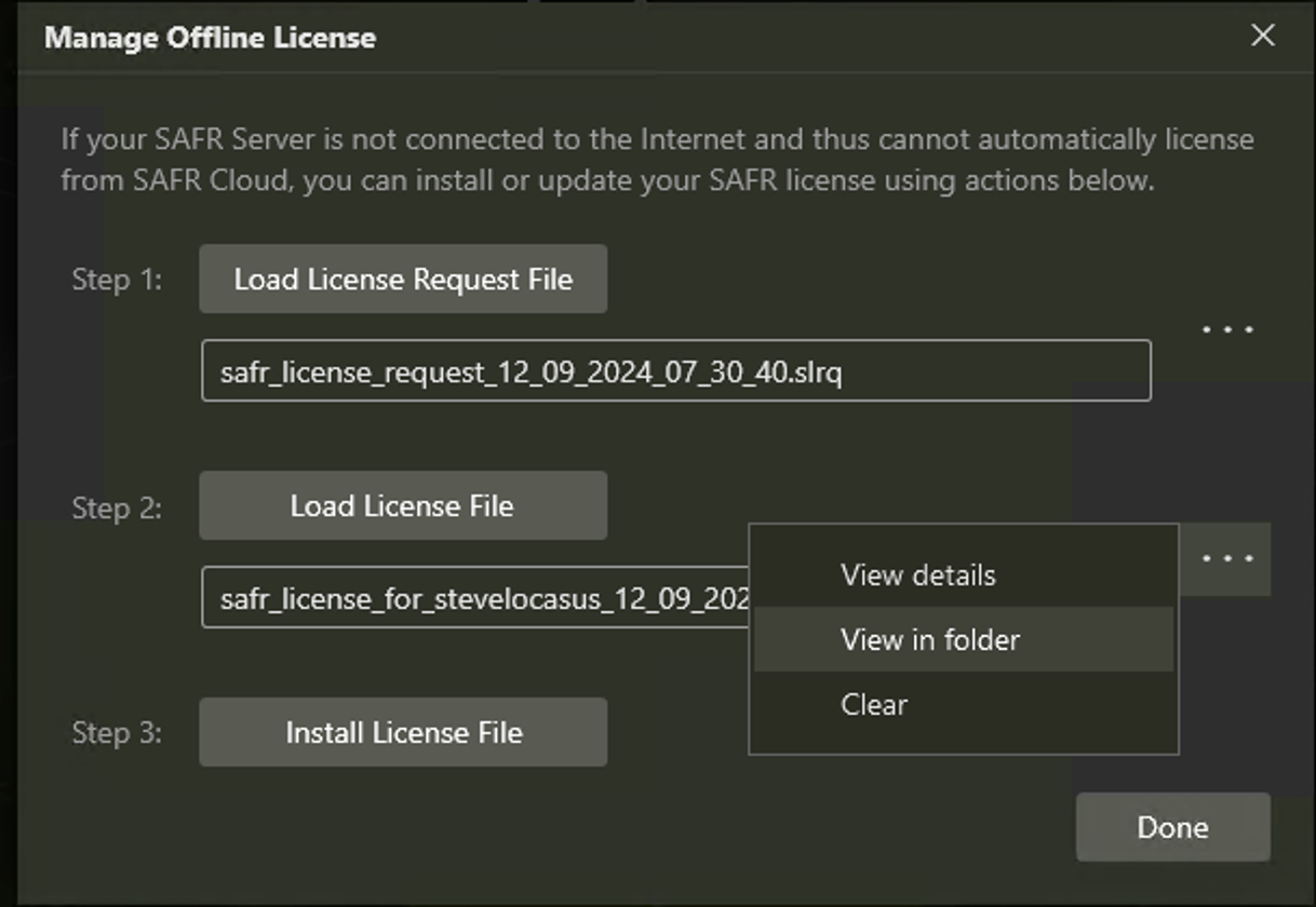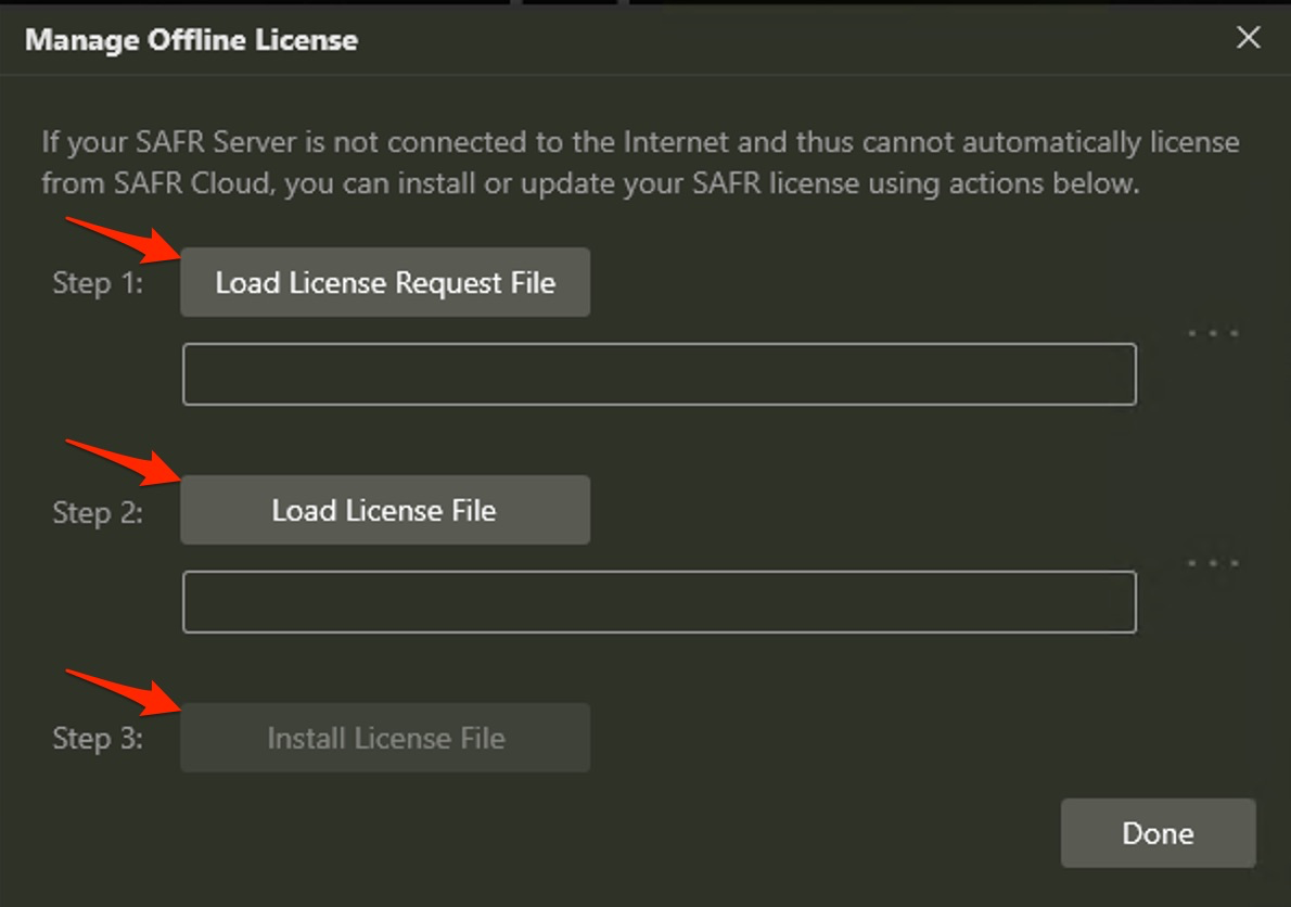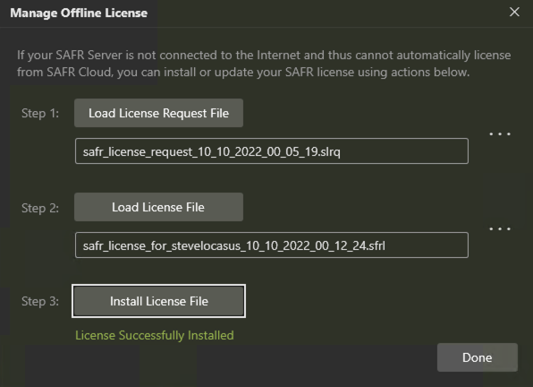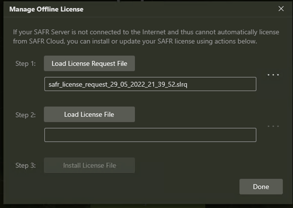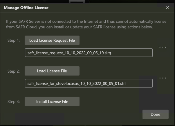 If your network is completely air-gapped, you will need to use a 2nd installation of SAFR Desktop to upload the License Request File (.slrq) and download the SAFR License File (.sfrl). See below for details.