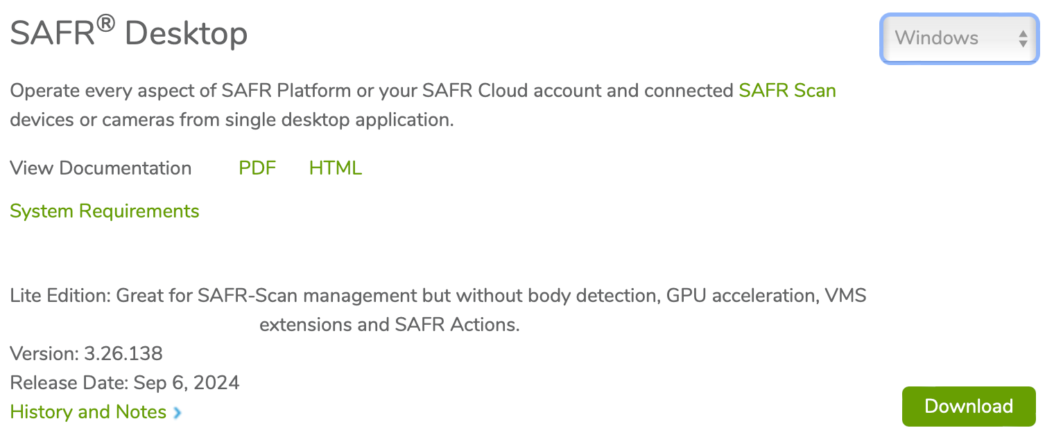 1. Open SAFR Downloads page at https://safr.real.com/download and download SAFR Desktop Lite Edition as shown below.