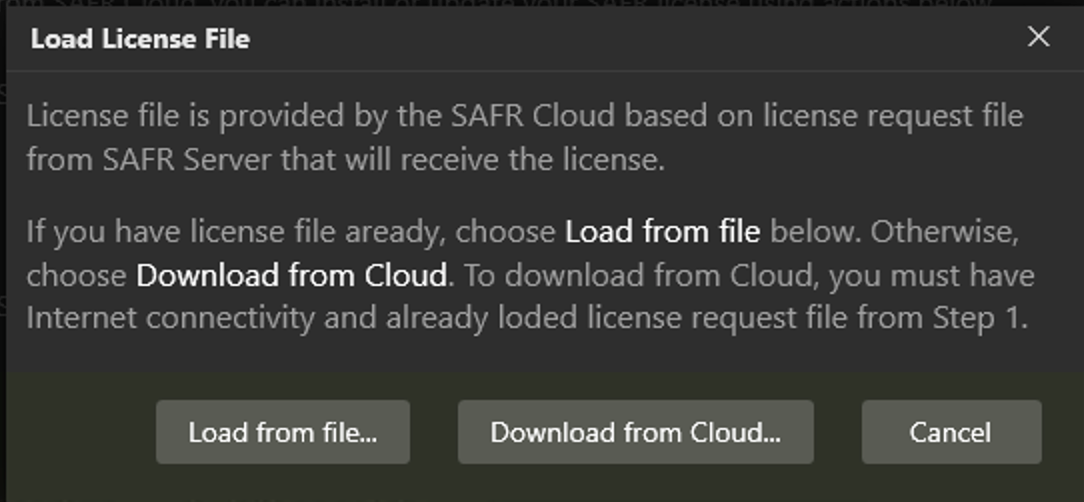 2. Click “Load License File” above and then Click “Download from Cloud…”. as shown below and enter your SAFR account credentials again.