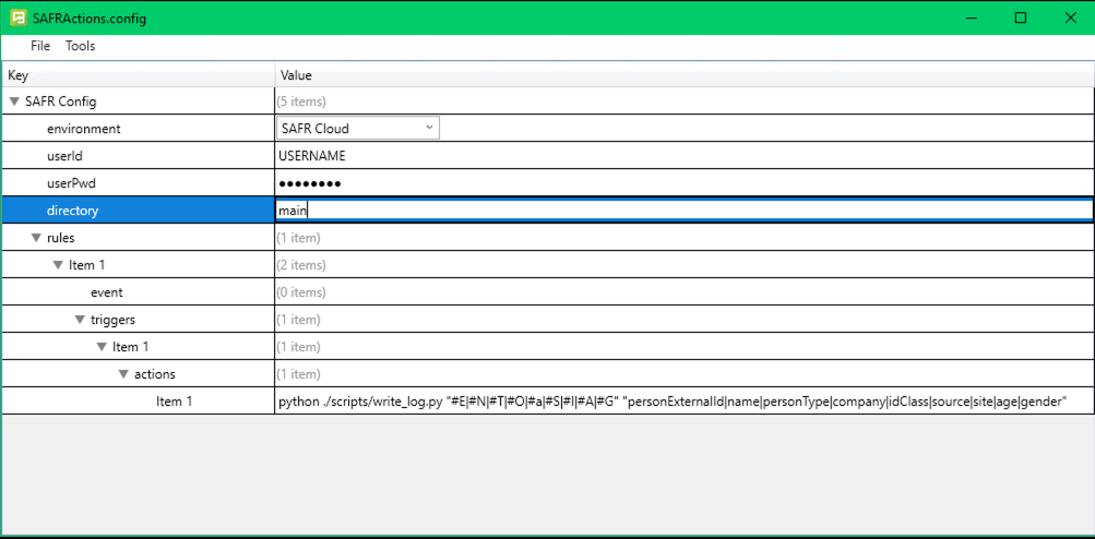 Open the SAFR Actions GUI application and edit the SAFRActions.config as follows: