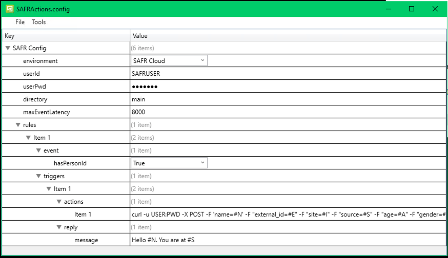 This solution uses curl to make an HTTP POST request, passing information from a recognition event to the external web service. The parameters that are passed can easily be customized to fit different needs. This way, you can change the columns that are written simply by editing the SAFR Actions configuration file. More details on this below.