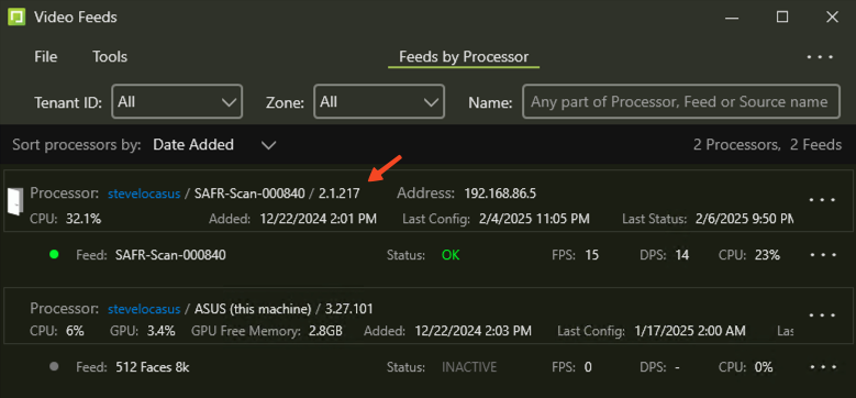 Alternatively, the version of SAFR SCAN can be viewed on the Video Feeds window of SAFR Desktop